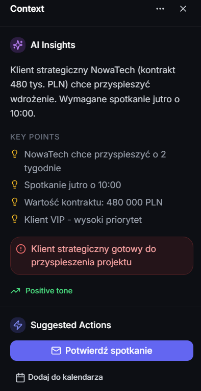Przed ExtBrain przygotowanie do spotkania z klientem zajmowało mi 30-40 minut szukania po mailach i plikach. Teraz to 3 minuty. Buduję na faktach, nie na pamięci.
